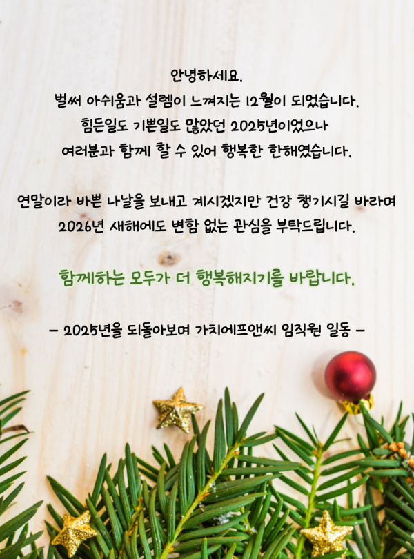 2025년 한해가 저물어 갑니다. 페이지 정보 작성자 가치에프앤씨 조회17회 작성일 25-12-08 15:49 본문 2025년 한해가 저물어가고 있습니다.모두 큰 일 없이 행복한 마무리 되시길 바랍니다. 목록